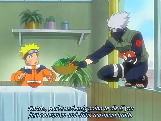 Kakashi: „Naruto, nemůžeš se dlouho živit ramenem s fazolemi a grilovaným vepřovým.“ Jestli chceš být ninja, musíš jíst zeleninu, víš zelené listy jako tohle.“